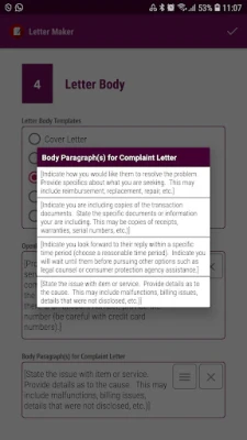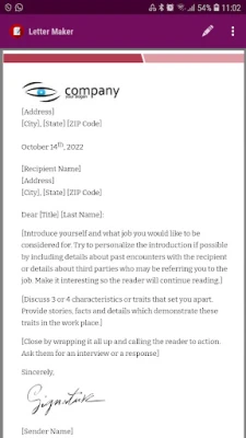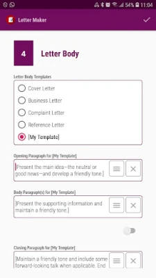 To write a letter, just choose prepared fragments of text. In this case, Letter Maker works as a letter generator and letterhead creator. You can correct the entered text, which will be automatically saved for later use. The Letter Maker App also allows you to use letter templates to write letters in different cases, such as Cover Letter, Business Letter, Complaint Letter, Reference Letter or your own letter template. You can associate each paragraph of these business letter templates with a list of text options that you will choose when writing letters in various situations.